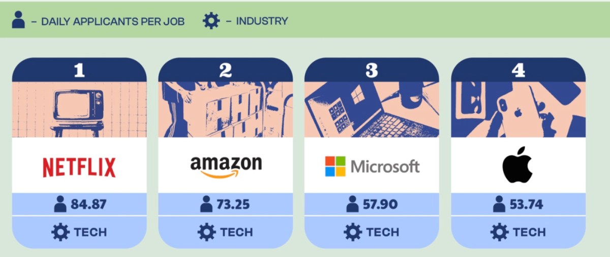 - The average Netflix job listing on LinkedIn receives more applicants per day (84.87) than any other company — making it the most competitive American firm overall to apply to.