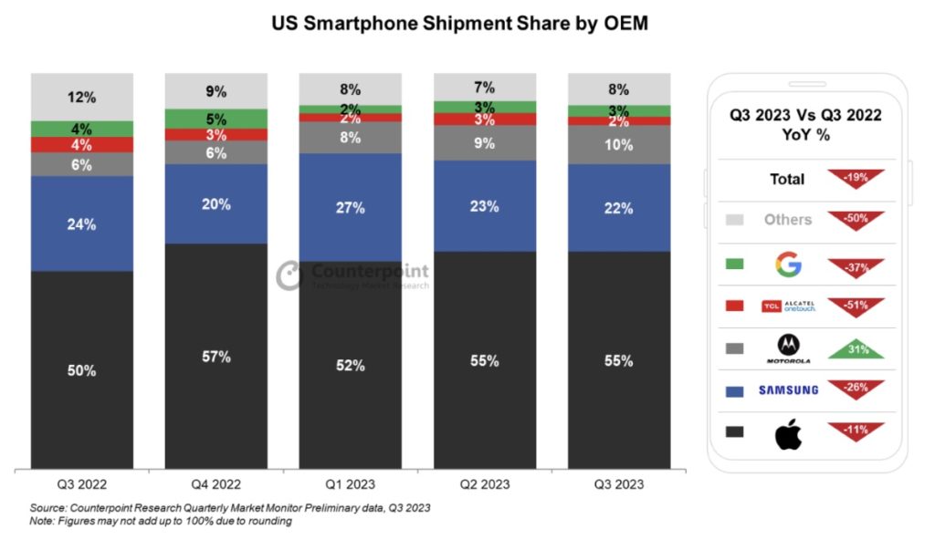 US smartphone shipments declined year-over-year (YoY) for the fourth straight quarter in quarter three (Q3) 2023 amid weak consumer demand, according to new data from Counterpoint Research. The annual decline in the third quarter was 19%.