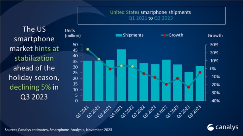 Canalys’ latest research reveals that the US smartphone market shrank another 5% year-on-year in quarter three (Q3) of 2023, continuing its downward trajectory.