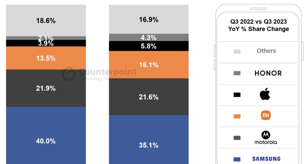 Samsung remained the region’s smartphone market leader. It invested in massive advertising in the region for the Z Flip 5 and Z Folder 5 during the quarter. However, Counterpoint says its sales and share declined YoY.