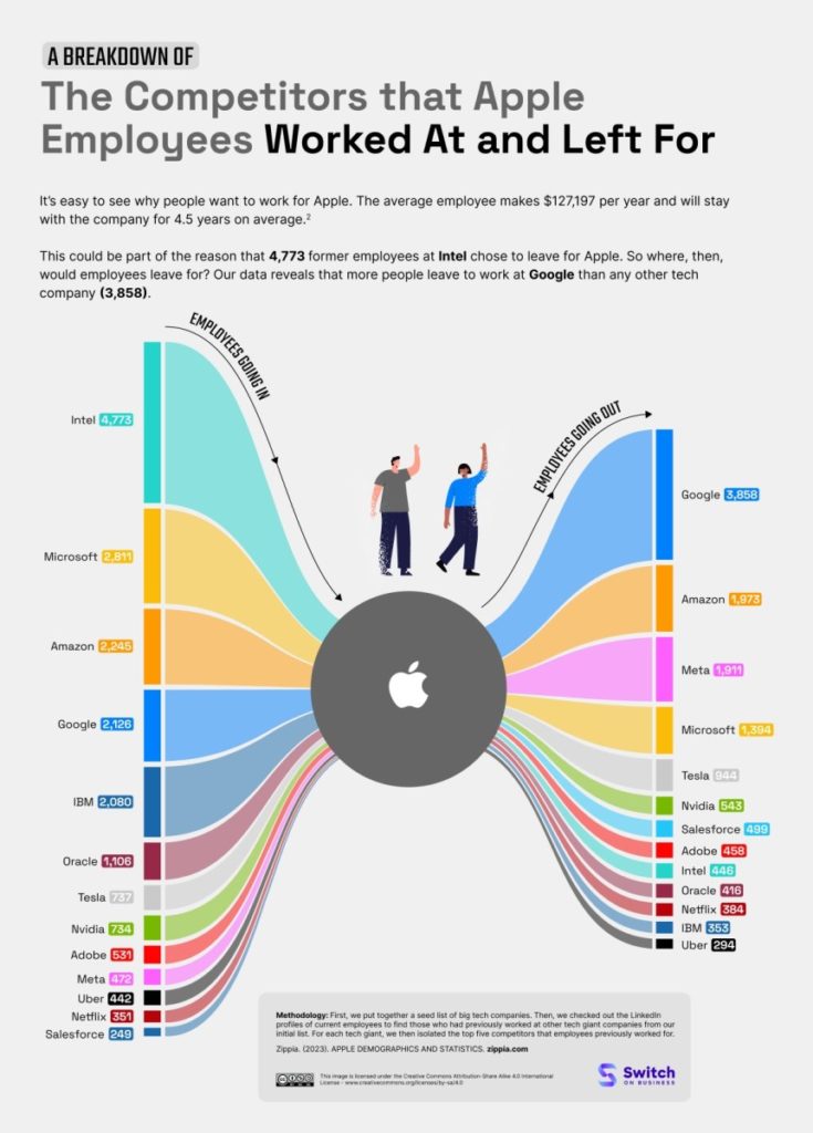 The data reveals that more people leave Apple to work at Google than any other tech company (3,858). The Switch on Business team analyzed LinkedIn employee profiles for Google (Alphabet), Amazon, Apple, Meta, Microsoft, IBM, Tesla, Oracle, Netflix, Nvidia, Salesforce, Adobe, Intel and Uber — calculating the number and percentage of employees who’ve moved from each of these companies to another.