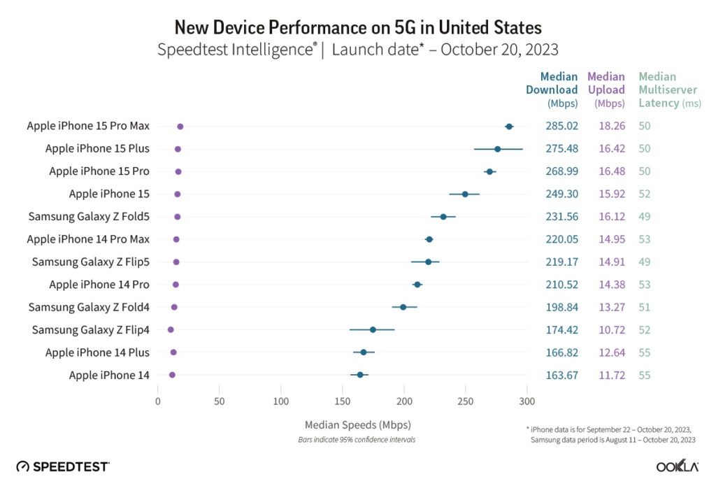 In the US, the iPhone 15 Pro Max was on top with 285.02 Mbps as the median 5G download speed. The rest of the iPhone 15 family took 2nd, 3rd, and 4th place, with the next closest device being the Samsung Galaxy Z Fold5 with 231.56 Mbps.