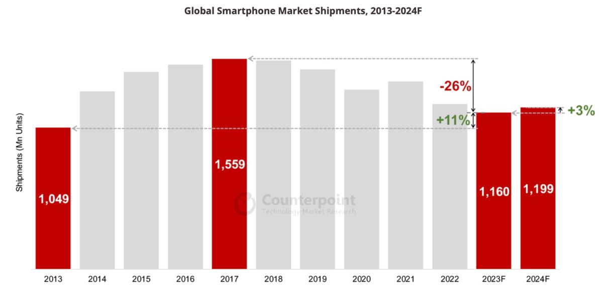 Global smartphone shipments in 2023 are projected to decline 5% year-over-year (YoY) to reach 1.2 billion, the lowest level in almost a decade, according to Counterpoint Research’s Smartphone 360 Global Smartphone Shipment Forecast.