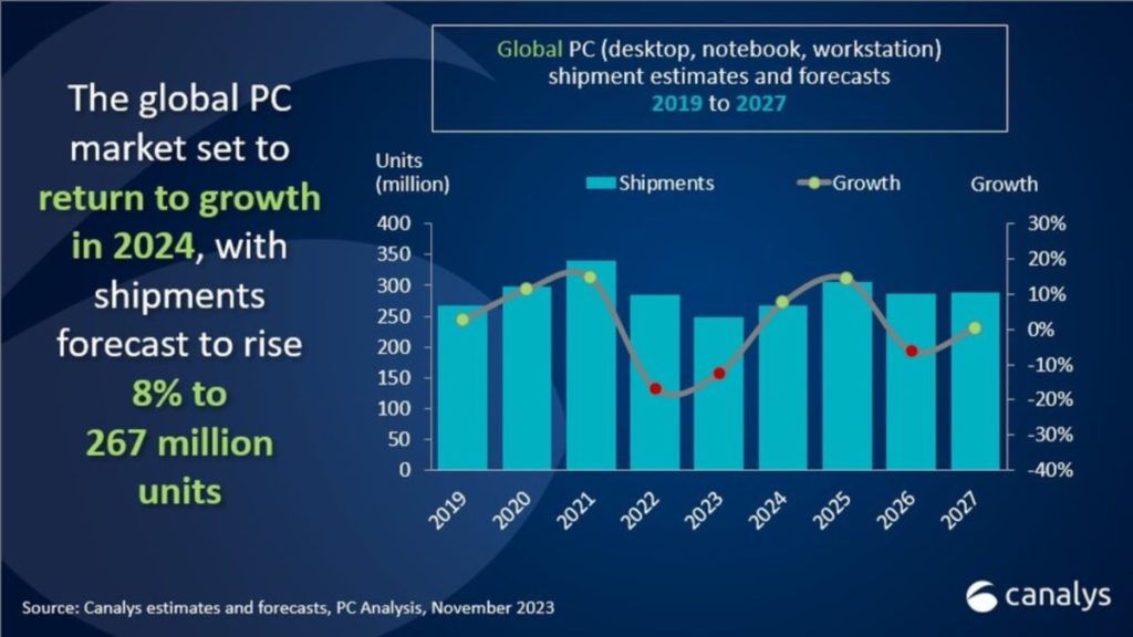 The research group says the market is expected to return to growth of 5% in quarter four (Q4) of 2023, boosted by a strong holiday season and an improving macroeconomic environment. Looking ahead, full-year 2024 shipments are forecast to hit 267 million units, landing 8% higher than in 2023, “helped by tailwinds including the Windows refresh cycle and emergence of AI-capable and Arm-based devices,” according to Canalys.