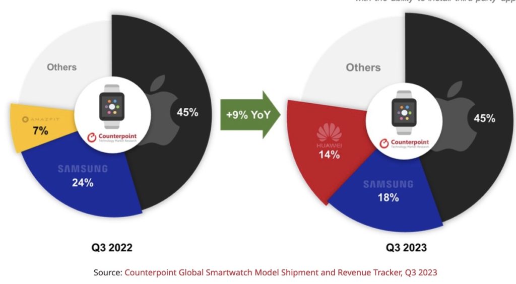 The global smartwatch market rebounded with a 9% year-over-year (YoY) rise in the third quarter (Q3) 2023 shipments, continuing the upward trend from the previous quarter, according to new data from Counterpoint Research.