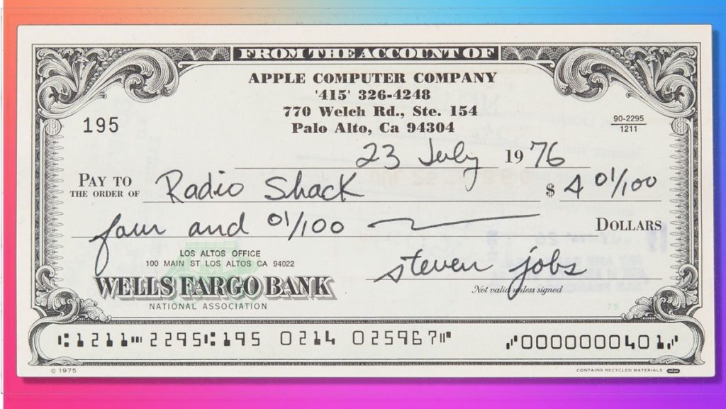 The check, bearing the iconic “Steven Jobs” signature, is payable to RadioShack for US$4.01. Dated during the summer of 1976, a mere four months after the founding of the Apple Computer Company, the check is linked to Apple’s first official address at “770 Welch Rd., Ste. 154, Palo Alto.” At the time, this location served as an answering service and mail drop.