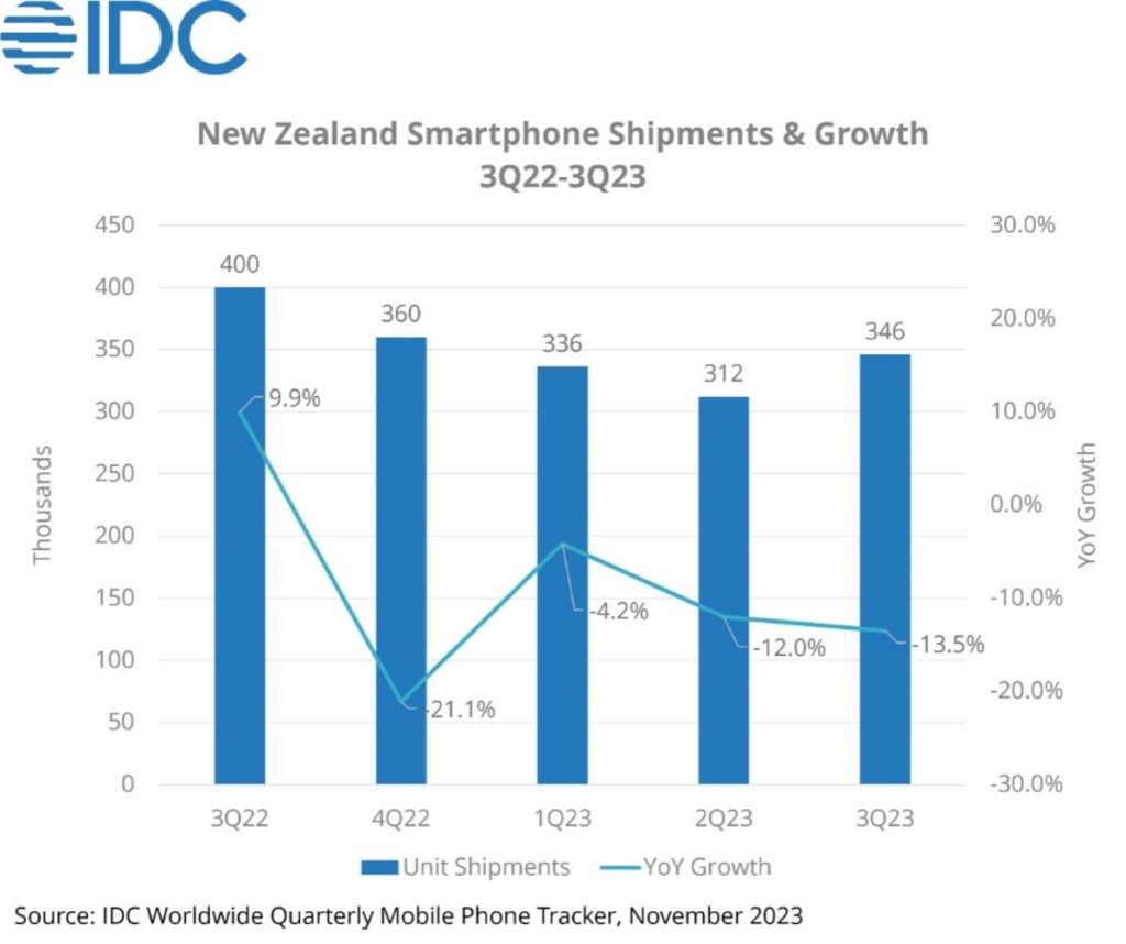 According to International Data Corporation ’s (IDC) Worldwide Quarterly Mobile Phone Tracker, New Zealand’s smartphone market declined by 13.5% year-on-year (YoY) in the third quarter of 2023 (3Q23), marking its fourth consecutive quarter of YoY declines. However, shipments grew by 10.9% in 3Q23 compared to 2Q23, notes the research group.