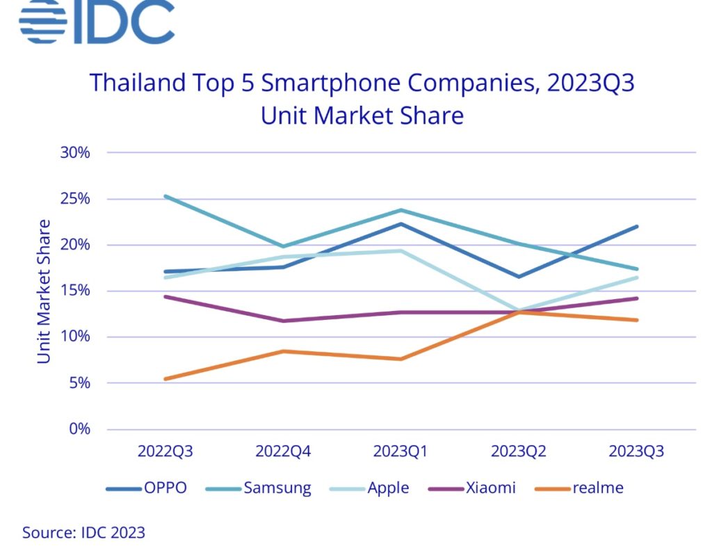 According to the International Data Corporation ’s (IDC) Worldwide Quarterly Mobile Phone Tracker, Thailand’s smartphone market saw initial signs of a recovery in 3Q23 after six consecutive quarters of annual decline as the market grew 1.6% year-over-year (YoY) and 8.3% quarter-over-quarter (QoQ).