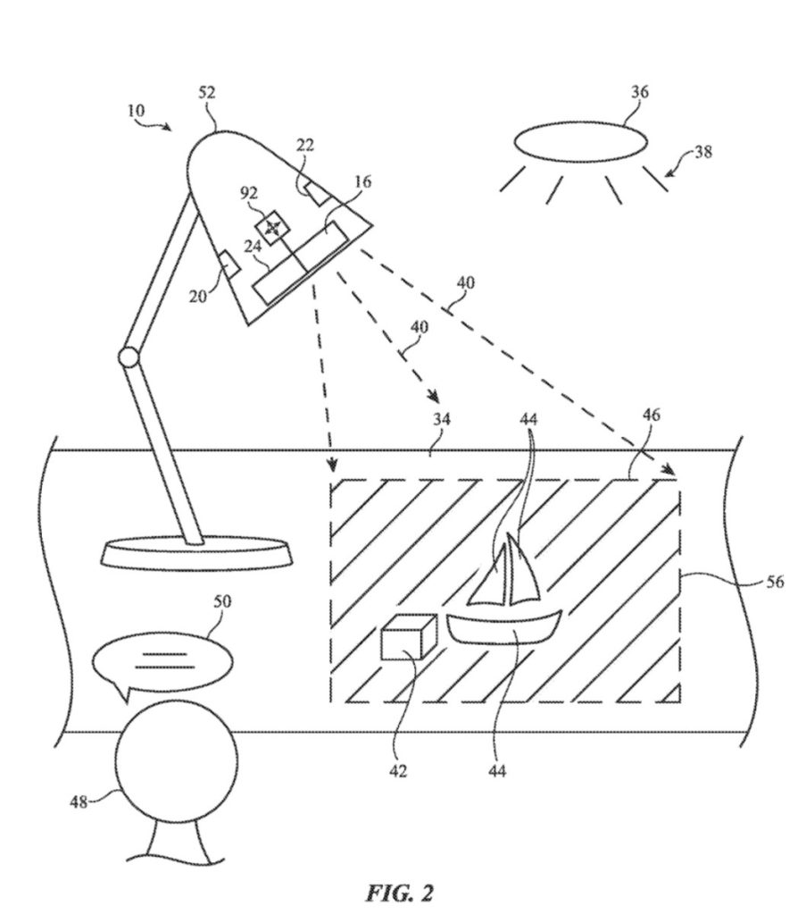 Here’s Apple’s abstract of the patent filing: “An electronic device may include an ambient light sensor that measures ambient light color, a projector that projects ambient-light-matching illumination onto a surface, a user input device such as a microphone that gathers user input, and a position sensor that measures a position of the surface, a user, and/or a real-world object relative to the device.