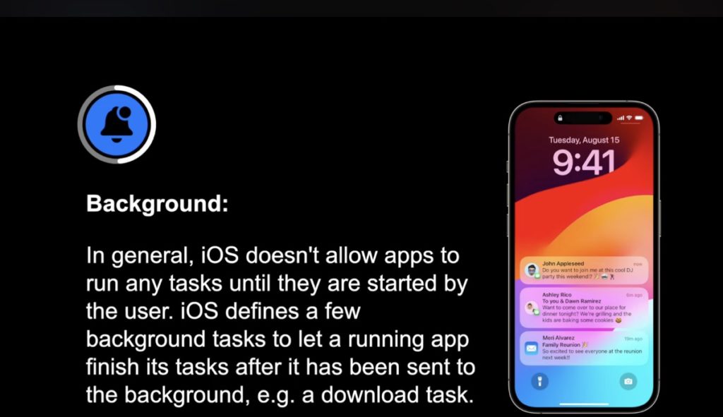 Apps on iOS don’t run in the background. iOS doesn’t allow apps to run in the background for a variety of reasons, mostly related to privacy and performance. Although iOS allows apps to run a few background tasks, access to background execution time is very restricted. But starting in iOS 10, iOS added a new feature to allow apps to customize push notifications even if they are not running. iOS wakes the app in the background when it receives a notification and allows the app a limited time to customize the notification before it is presented to the user. This includes decrypting an encrypted payload and downloading additional content to enrich the notification. Once the app hands in the customized notification to the system or the background time allocated runs out, the app is terminated.