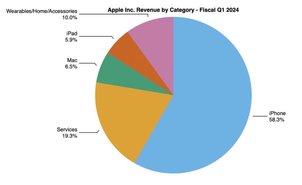 In terms of revenue, the iPhone accounted for 58.3% of Apple’s revenue in the fiscal first quarter of 2024. Services were 19.3%, Wearables/home/accessories was 105, the Mac was 6.5%, and the iPad 5.9%.