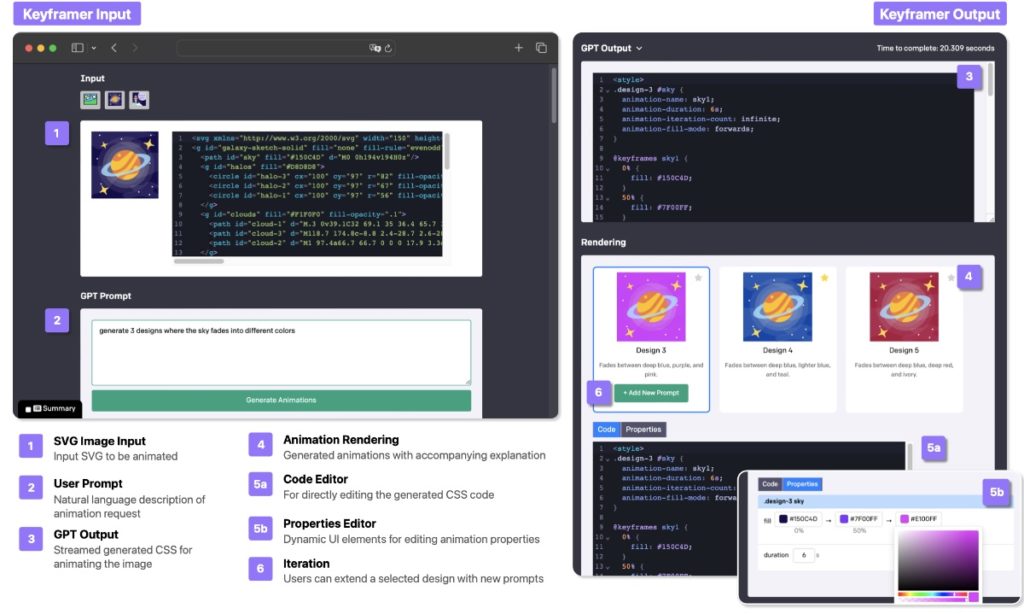 Here’s how Apple describes the tool: “Keyframer is an large language model (LLM)-powered animation prototyping tool that can generate animations from static images (SVGs). Users can iterate on their design by adding prompts and editing LLM-generated CSS animation code or properties. Additionally, users can request design variants to support their ideation and exploration.