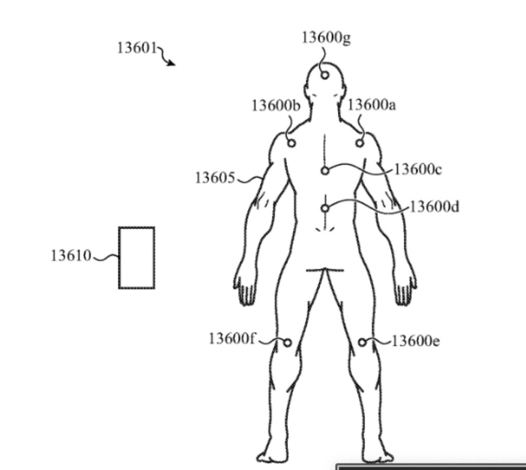 Here’s Apple’s abstract of the patent: “A posture-monitoring system for monitoring a body posture of a user includes an array of wirelessly locatable tags, including a first tag configured to be positioned along a first shoulder region of the user and having a first battery and a first wireless circuit configured to transmit a first locating signal, a second tag configured to be positioned along a second shoulder region of the user and having a second battery and a second wireless circuit configured to transmit a second locating signal, and a third tag configured to be positioned along a back region of the user and having a third battery and a third wireless circuit configured to transmit a third locating signal.
