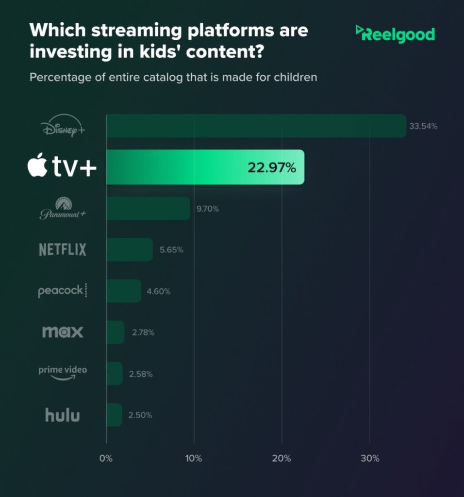 Disney’s percentage of its entire catalog made for children is 33.54%, while Apple’s is 22.97%. The percentages of other streaming services are: Paramount+ (9.70%), Netflix (5.65%), Peacock (4.60%), MAX (2.78%), and Hulu (2.50%).