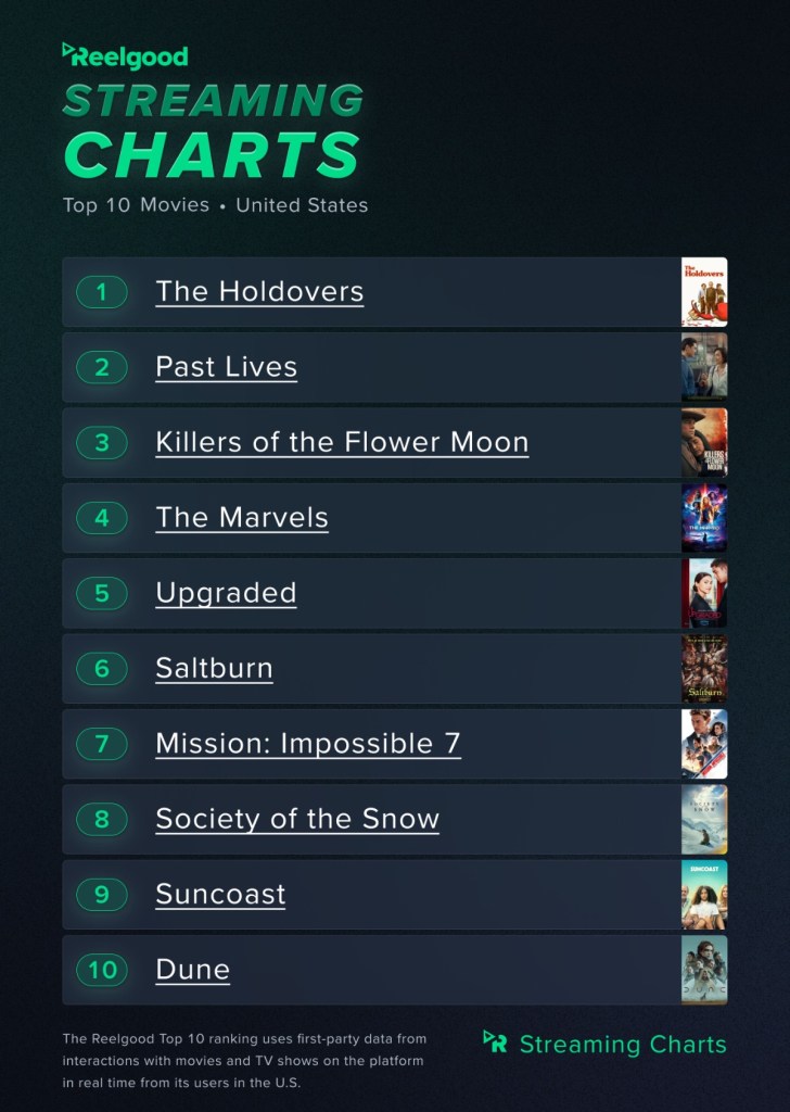 Apple TV+’s”Masters of the Air” and “Killers of the Flower Moon” are , respectively, numbers six and number three on the list of streaming TV shows and movies, as compiled by the Reelgood streaming guide.