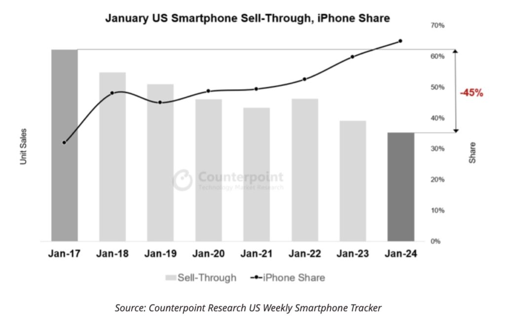 According to preliminary data from Counterpoint Research’s 2024 US Weekly Sell-Through Tracker, January smartphone sales in the U.S. declined by 10% year-over-year (YoY) with the trend likely to continue for the full month.