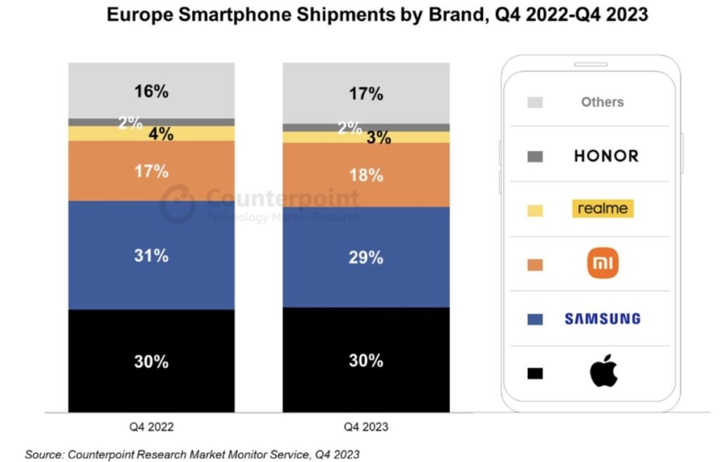 Europe’s smartphone shipments declined 3% year-over-year (YoY) in quarter four (Q4) 2023, according to the latest report from Counterpoint Research.