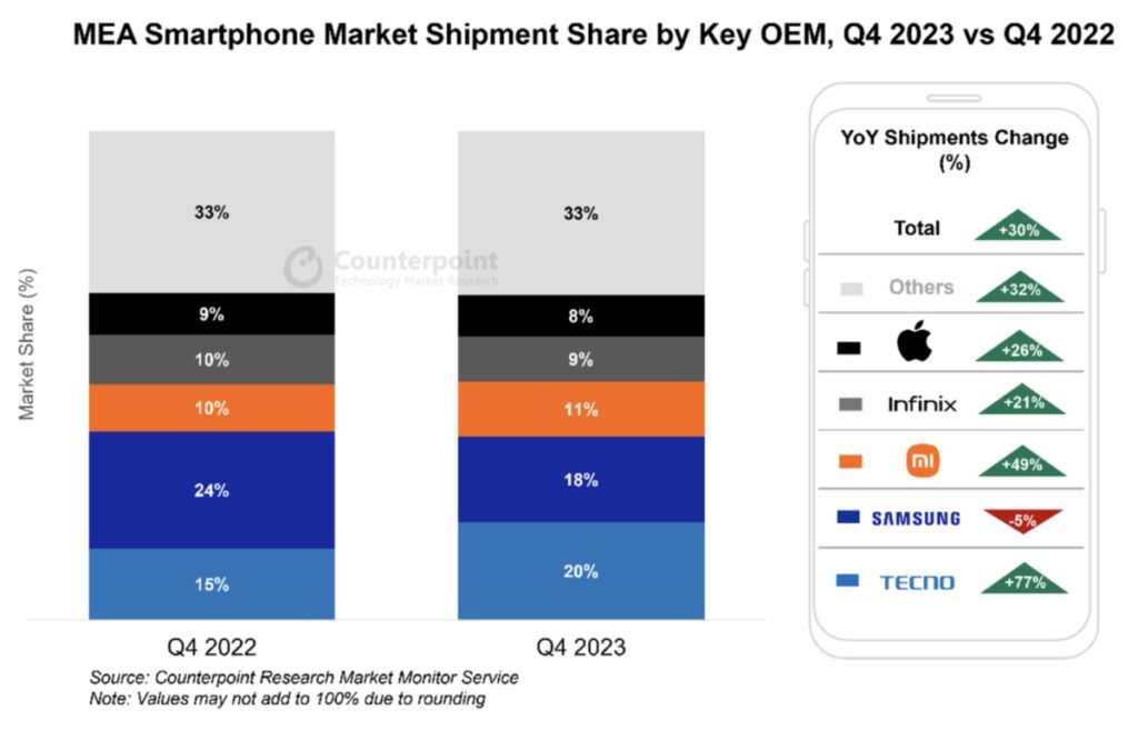 Smartphone shipments in the Middle East and Africa (MEA) region increased 26% year-over-year (YoY) and 9% quarter-over-quarter (QoQ) in quarter four (Q4) of 2023, according to the latest research from Counterpoint Research.