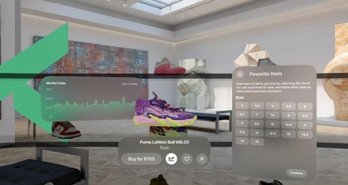 - Immersive sneaker showcase: Bring your shopping to life with 3D models of top sneaker releases that appear on shelves in your home environment. Interact with products in a hyper-realistic manner, examining the craftsmanship and detail of each item as if it were right in front of you.