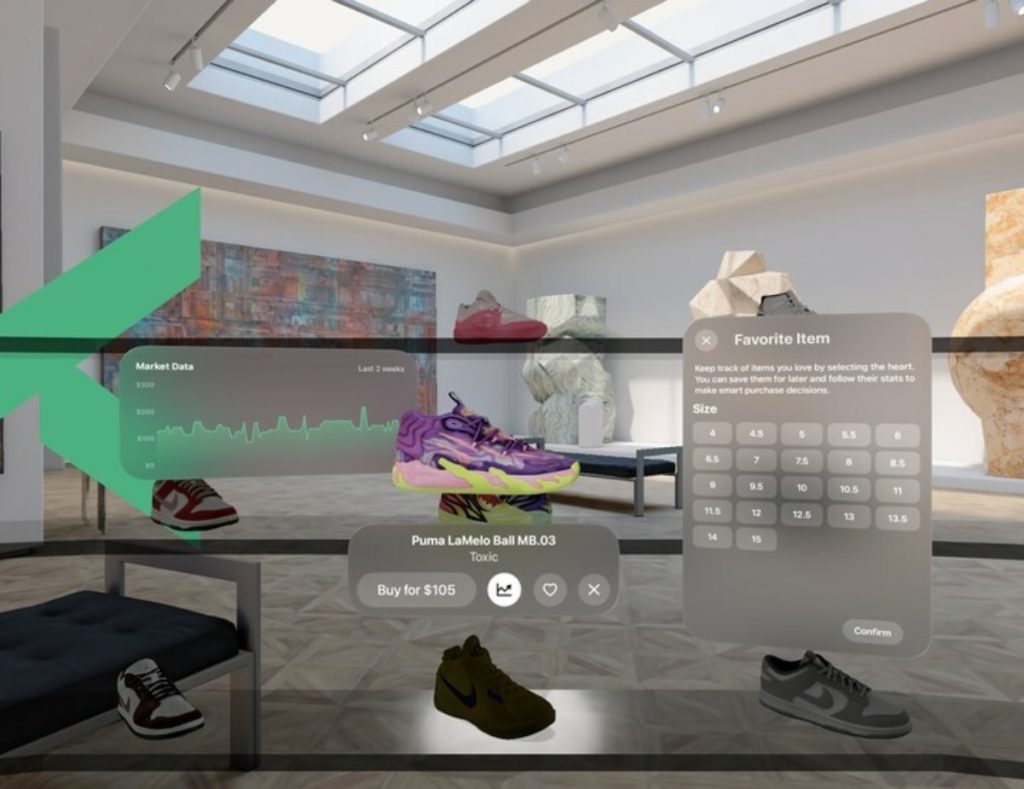 - Immersive sneaker showcase: Bring your shopping to life with 3D models of top sneaker releases that appear on shelves in your home environment. Interact with products in a hyper-realistic manner, examining the craftsmanship and detail of each item as if it were right in front of you.