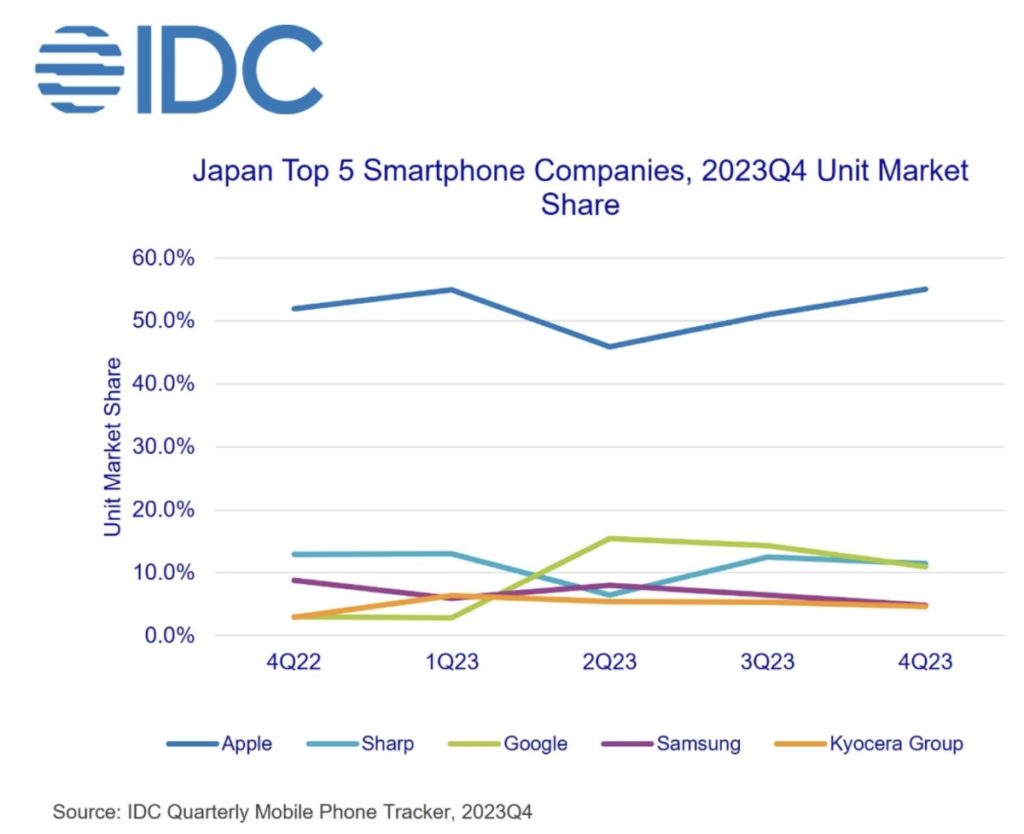 For fiscal year 2023 mobile phone shipments in Japan decreased by 11.6% YoY, totaling 30.3 million units. In smartphones, iPhone shipments decreased by 6.1% YoY and Android-based devices decreased by 16.3% YoY.