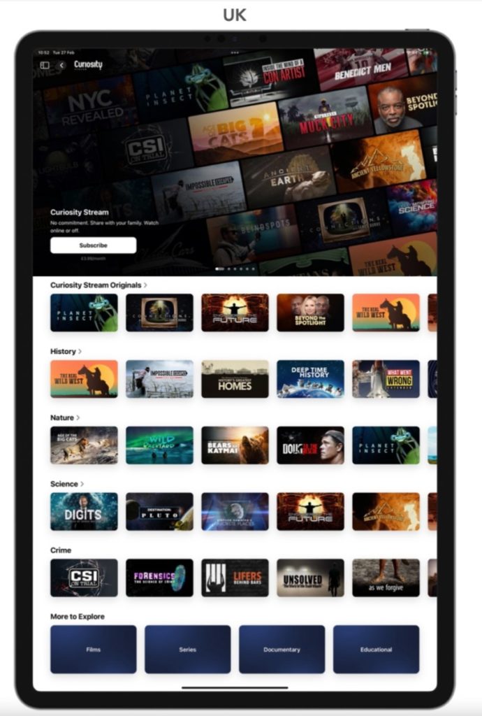 Curiosity Inc., a global factual entertainment and media company, has launched its Curiosity Stream app as a subscription channel in the Apple TV app on iPhone, iPad, and Apple TV 4K across 23 European countries.