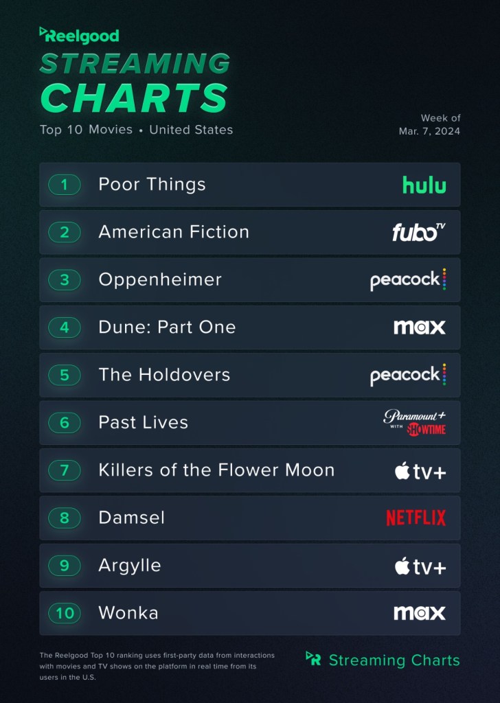Apple TV+’s “Masters of the Air,” “Killers of the Flower Moon,” and “Argylle’ make the latest Reelgood list of the most-watched streaming TV shows and movies. Reelgood Streaming Charts monitor 20 million viewing decisions each month across every streaming network in the U.S.