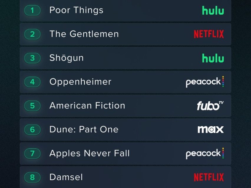 “Argylle’ is number seven and “Killers of the Flower Moon” is number nine on the list of the most-watched movies. Reelgood Streaming Charts which monitor 20 million viewing decisions each month across every streaming platform in the U.S.