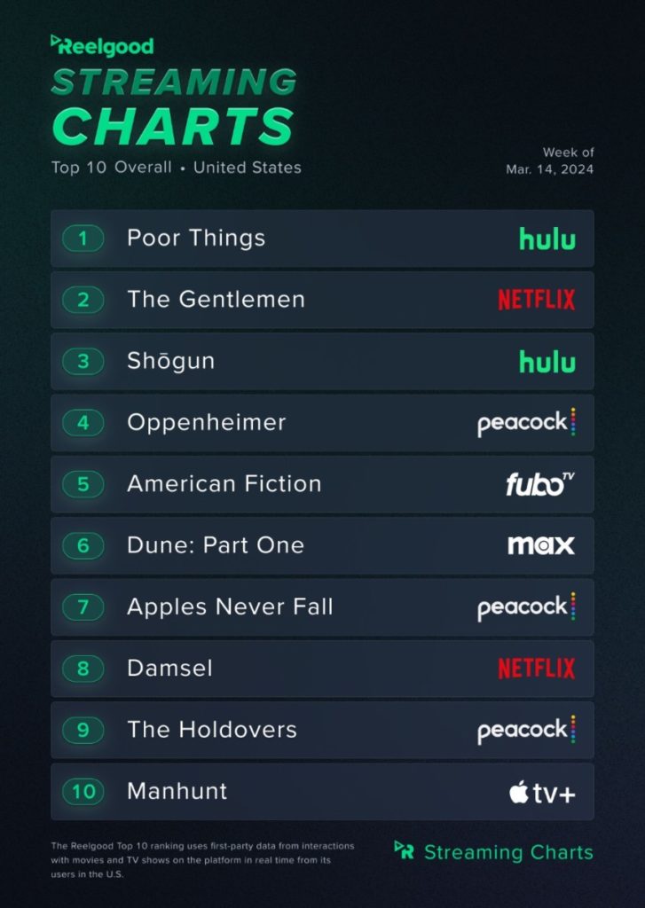 “Argylle’ is number seven and “Killers of the Flower Moon” is number nine on the list of the most-watched movies. Reelgood Streaming Charts which monitor 20 million viewing decisions each month across every streaming platform in the U.S.