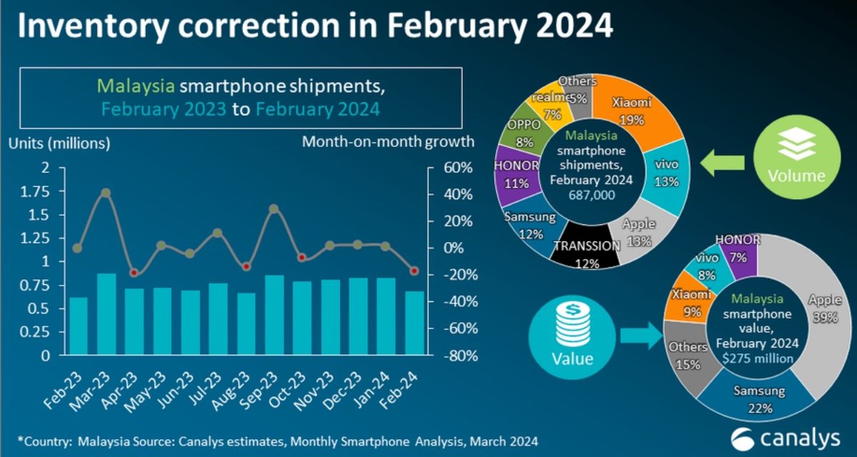 Apple saw strong volume growth of 168% year-on-year in Malaysia in February, shipping 86,000 iPhone units while also leading in shipment by sales value, according to Canalys.