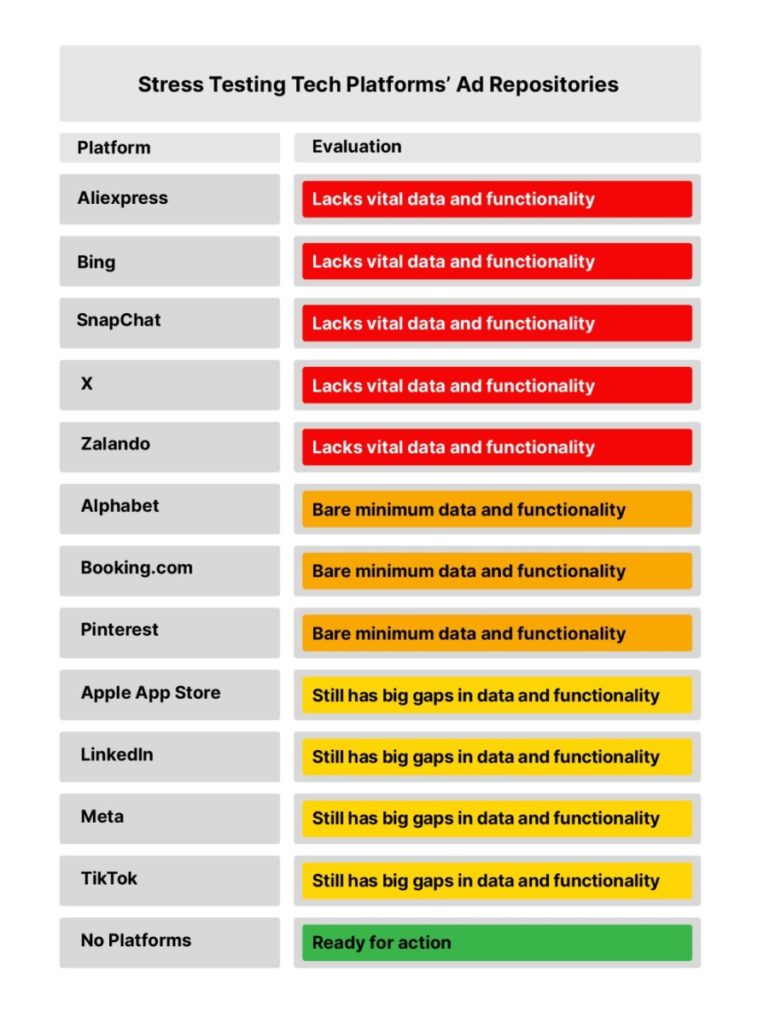 A new report dubbed “Full Disclosure: Stress-testing tech platforms’ ad repositories” by Mozilla and Checkfirst investigated the Apple App Store, AliExpress, Bing, Booking.com, Alphabet’s Google Search & YouTube, LinkedIn, Meta, Pinterest, Snapchat, TikTok, X, and Zalando.