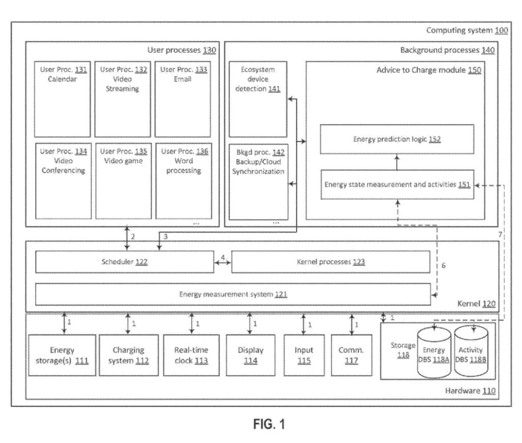 Apple says that what’s needed is a system for predicting when a user charges her computing system, and whether the computing system charge level will be below a predetermined threshold amount before the next predicted charging time. And then alerting the user that charging is needed.