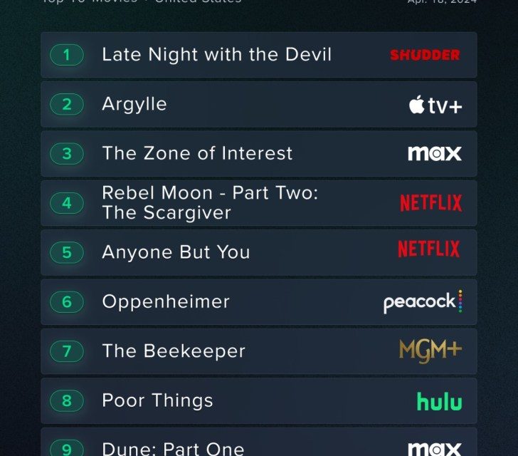 Apple TV+s “Argylle” movie ranks sixth on the list of most watched streaming TV movies and shows April 18-April 24, as determined by the Reelgood streaming guide.