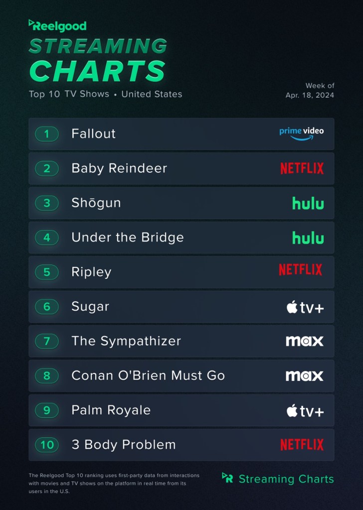 It also ranks second on the most watched movies list. Meanwhile, Apple TV+’s “Sugar” and “Palm Royale” place sixth and ninth, respectively, on the list of most watched TV shows.