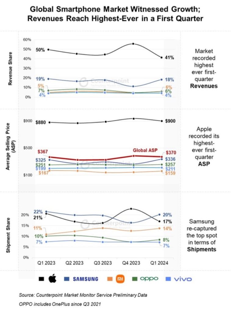 Most of the global smartphone growth comes from key regions such as Europe, Middle East and Africa (MEA) and Caribbean and Latin America (CALA), according to Counterpoint. Worldwide smartphone revenues grew by 7% YoY in Q1 2024 and reached the highest-ever in a first calendar quarter.