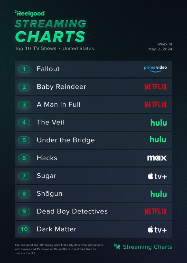 “Sugar” is number seven on the list. That’s down from number six a week ago. In its debut week, “Dark Matter” arrives at number 10. With “Argylle” dropping out of the top 10, Apple TV+ has no movies in Reelgood’s “Top 10 Most-Watched Movies” list.