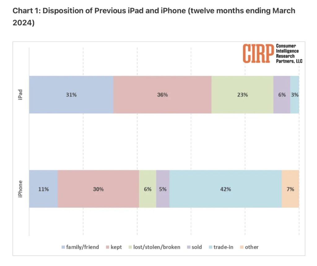 The question remains, what drives iPad upgrades, and to what extent does a new model lineup matter to existing iPad owners? To answer that, CIRP looked at what iPad owners do with their “old” iPad when they get a new one. To calibrate that data, the research group compared it to what iPhone owners do with their previous phone when they upgrade.