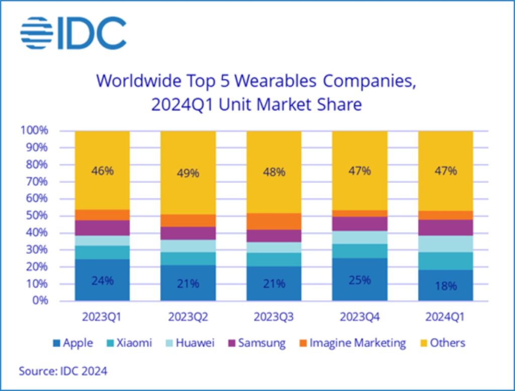 Apple sold 20.6 million wearable devices in 1Q24 compared to in 25.4 million 1Q23. The tech giant’s global market share declined from 24.5% to 18.2% year-over-year.