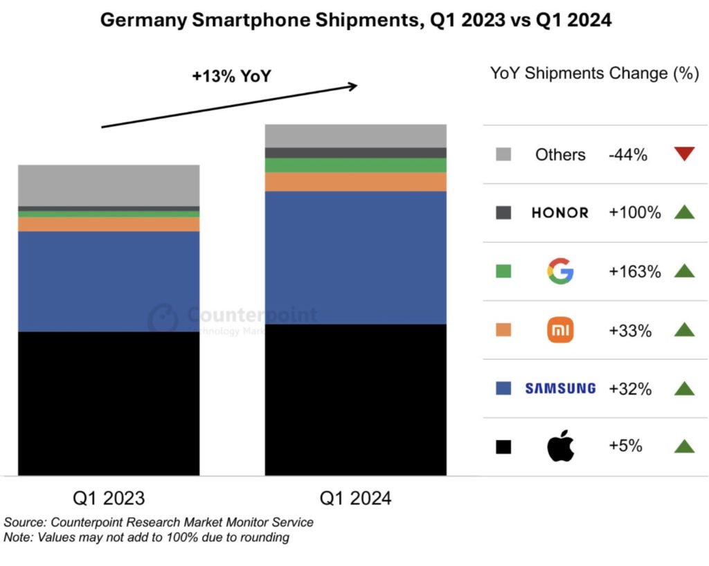 Germany’s smartphone shipments rose 13% year-over-year (YoY) in the first quarter of 2024, as the market finally returned to growth after eight consecutive quarters of decline, according to Counterpoint Research’s Q1 2024 Market Monitor Shipment Tracker. And it was good news for Apple.