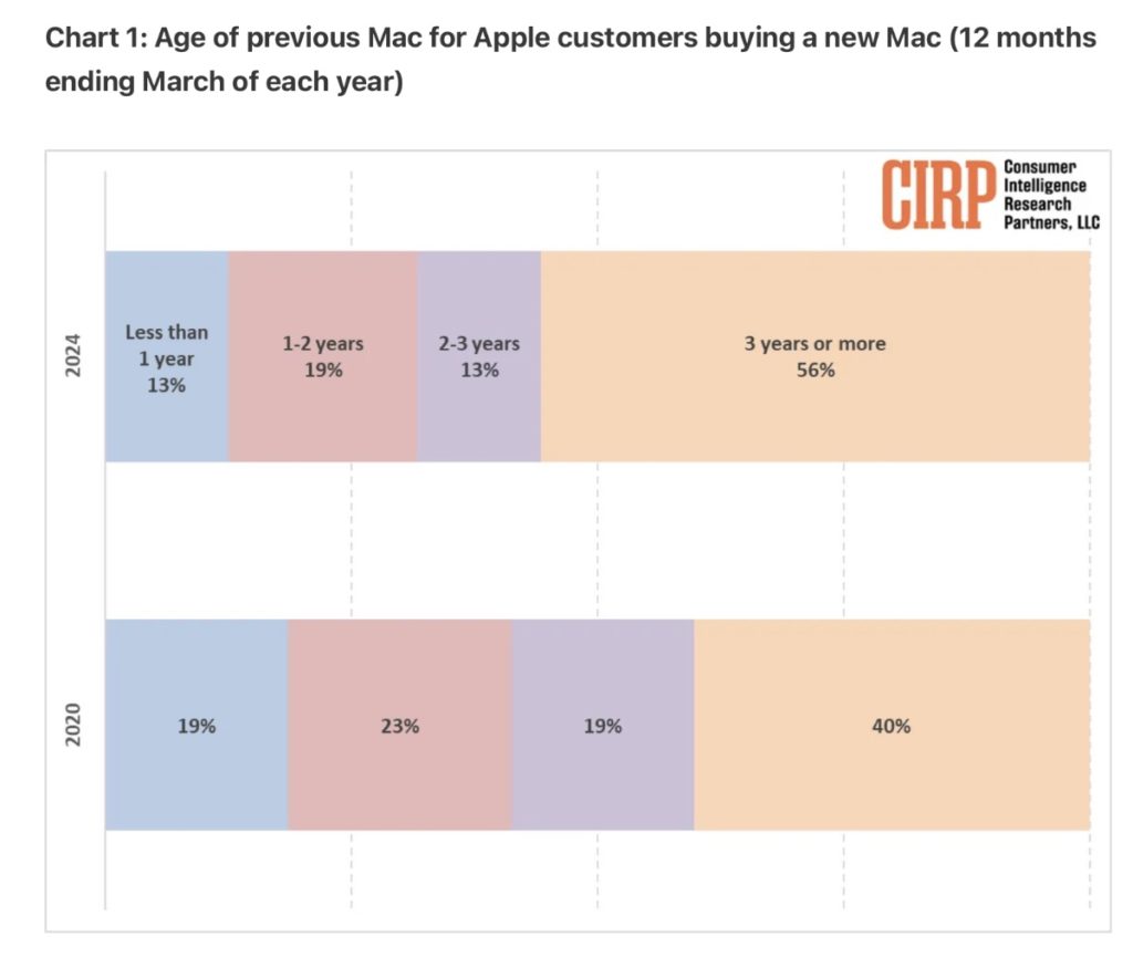 In the most recent 12-month period, CIRP says the percent of iPhone and Mac computer owners whose previous device was older than two years increased to 71% and 68%, respectively. In 2020, 63% of iPhone owners and 59% of Mac computer owners reported owning their previous device for two years or more. Older iPad owners showed a somewhat smaller increase.