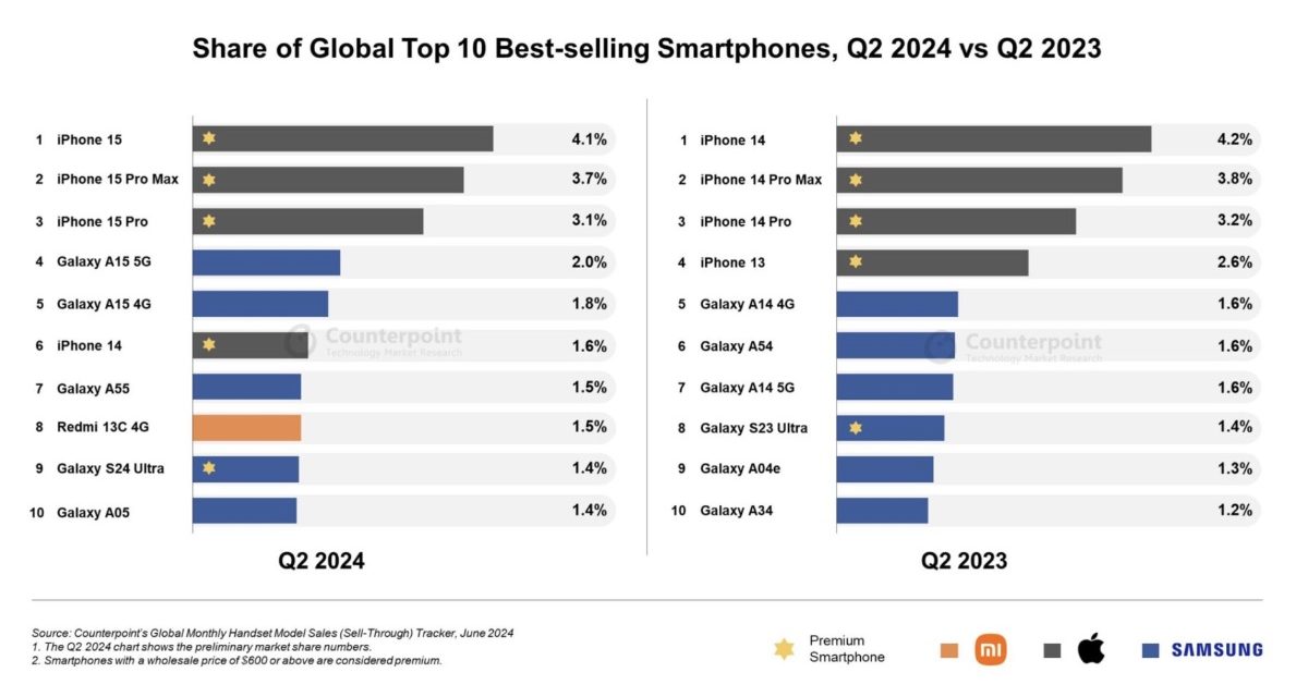 Looking at the bigger picture, the number of premium phones in the top 10 in Q2 2024 was five, the same as in Q2 2023, but their cumulative sales as a share of the global smartphone market fell by about 1.5%.