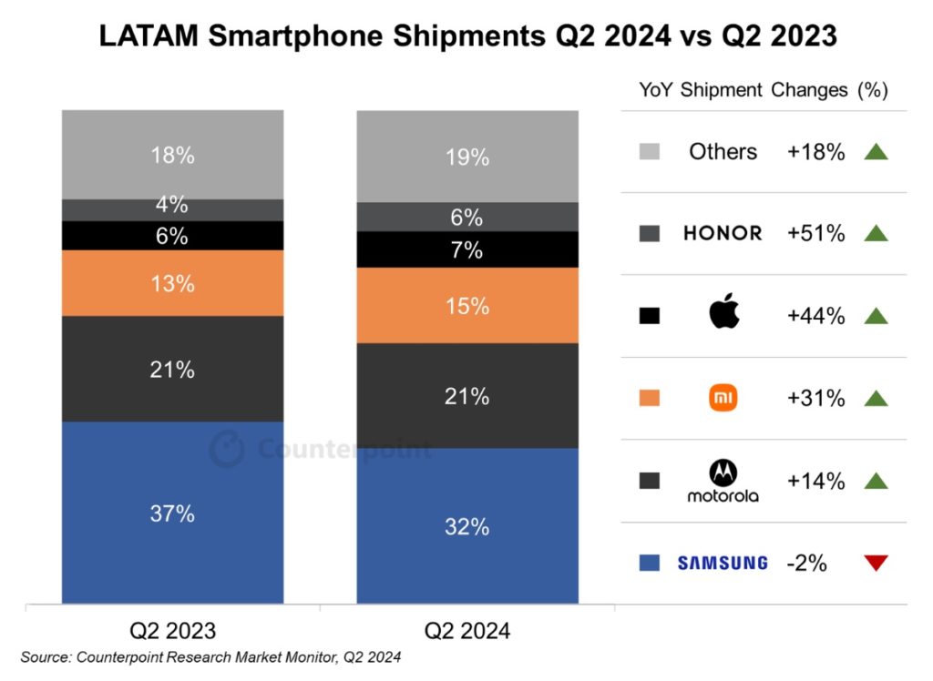 Latin America’s (LATAM’s) smartphone shipments increased by 14.5% year-over-year in quarter two of 2024, according to Counterpoint’s latest Market Monitor report.