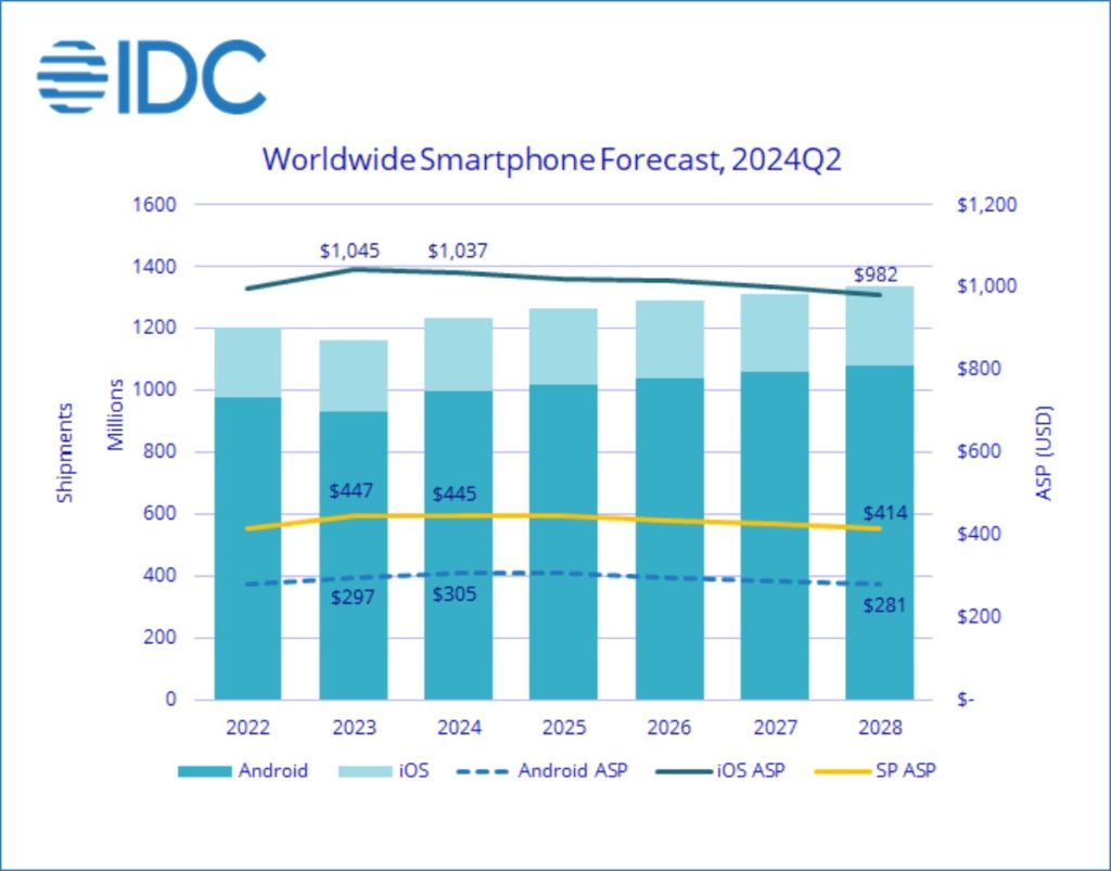 Worldwide smartphone shipments are forecast to grow 5.8% year over year in 2024 to 1.23 billion units, according to the International Data Corporation (IDC) Worldwide Quarterly Mobile Phone Tracker.