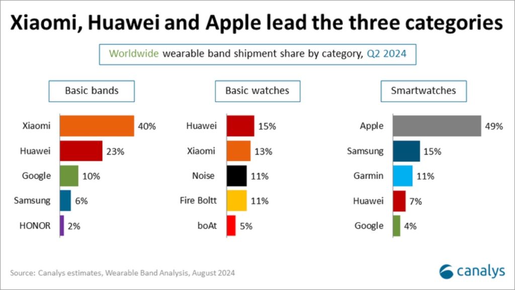 Canalys says Apple had 48% of the global wearable band shipments in the second quarter of 2024. According to Canalys’ latest findings, global wearable band shipments grew 0.2% in Q2 2024 to 44.3 million devices. Basic watches continued to drive the market, with shipments up 6% year on year, largely thanks to Huawei and Xiaomi. Basic watches accounted for 48% of the wearable band market, their highest share yet.