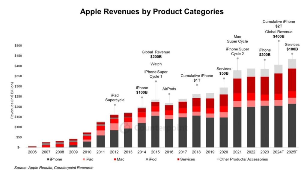 Apple’s global revenues are expected to cross the $400-billion mark for the first time in 2024, according to Counterpoint Research’s latest projections. This record number is expected to be driven by growth in both hardware and services segments.