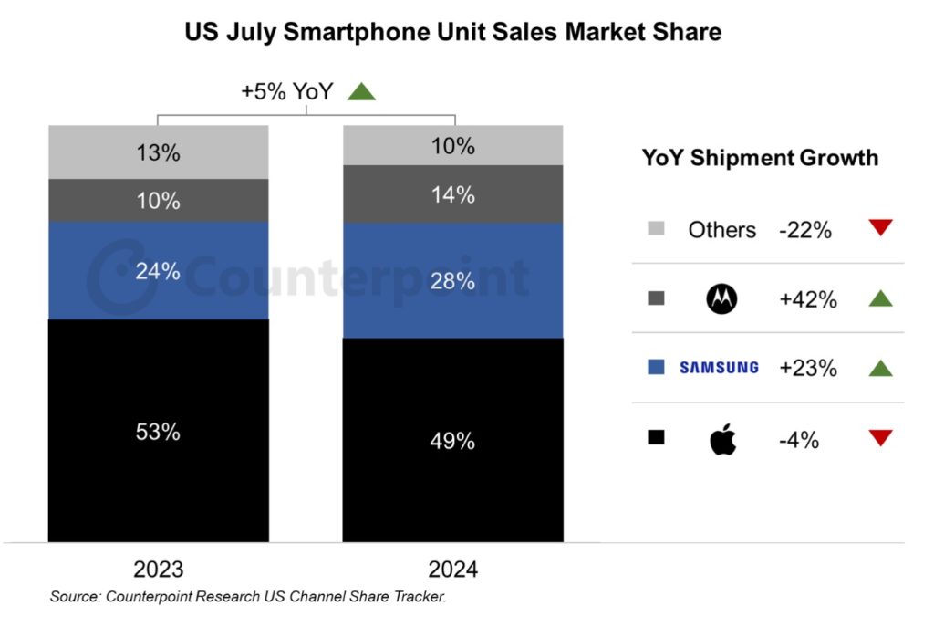 The US smartphone market’s sales grew 5% year-over-year (YoY) in July driven mainly by Samsung and Motorola, according to Counterpoint Research’s latest US Smartphone Channel Share Tracker.