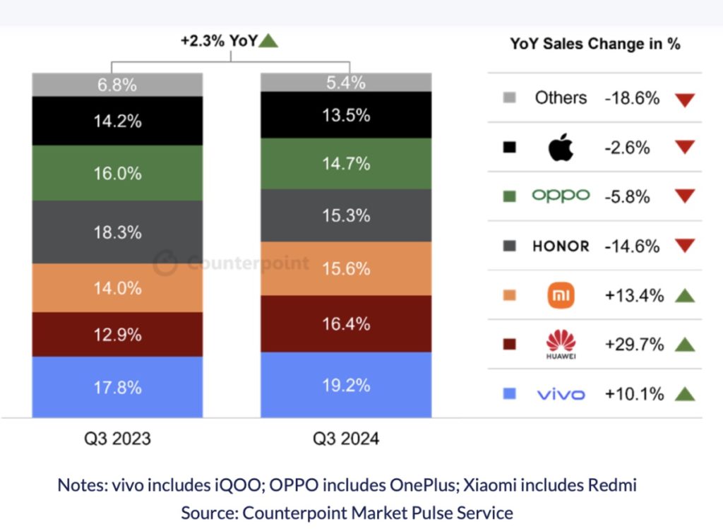 China’s smartphone sales increased 2.3% year-over-year (YoY) in quarter three (Q3) of 2024, on track to realize their first annual growth in five years, reports Counterpoint Research.