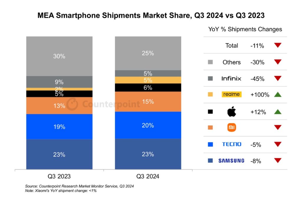 Smartphone shipments in the Middle East and Africa (MEA) region declined 11% year-over-year (YoY) and 5% quarter-over-quarter (QoQ) in quarter three (Q3) of 2024, according to the latest research from Counterpoint’s Market Monitor Service. However, it was mostly good news for Apple.