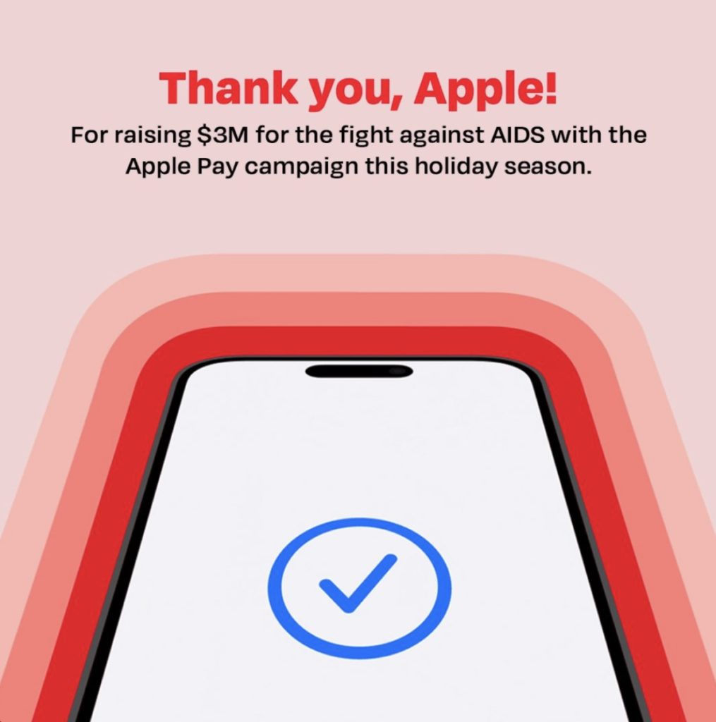 In an X post, (RED) says that Apple donated US$5 for every Apple Pay purchase made at Apple from Nov 29 – Dec 8, raising a total of $3 million for the The Global Fund to Fight AIDS, Tuberculosis and Malaria.