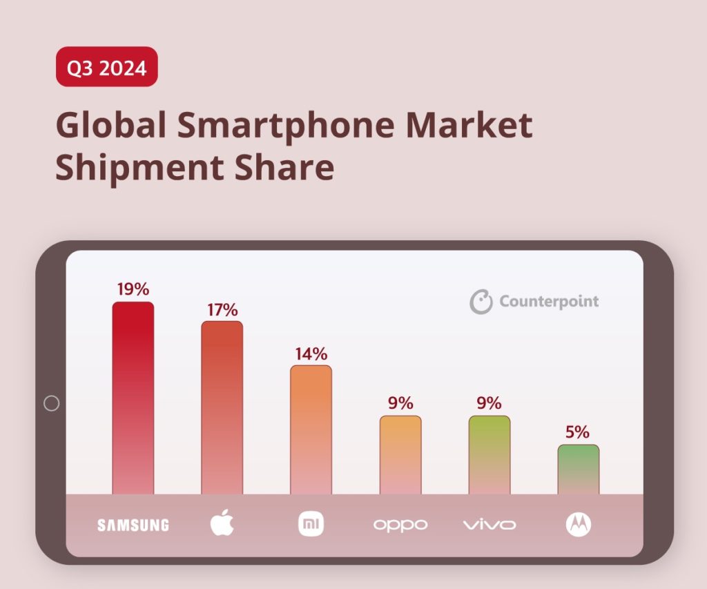 Global smartphone revenues rose 10% year-over-year (YoY) in the quarter, driven by a 7% increase in ASP. Both revenue and ASP hit their highest levels ever for Q3, according to Counterpoint. Samsung retained the top position globally with a 19% volume share.